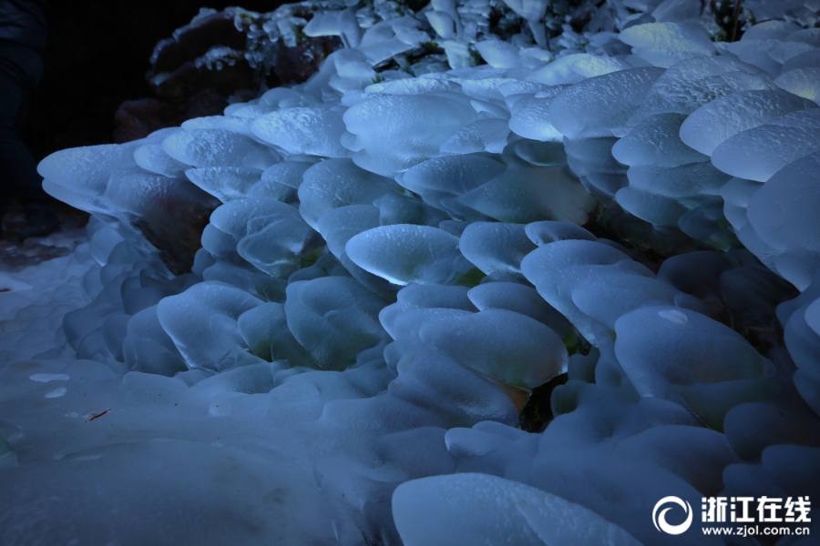 近日,受低温影响,海拔800米的余姚四明山鹁鸪岩溶洞瀑布结起冰瀑。(浙江在线 拍友 周耀辉 摄)