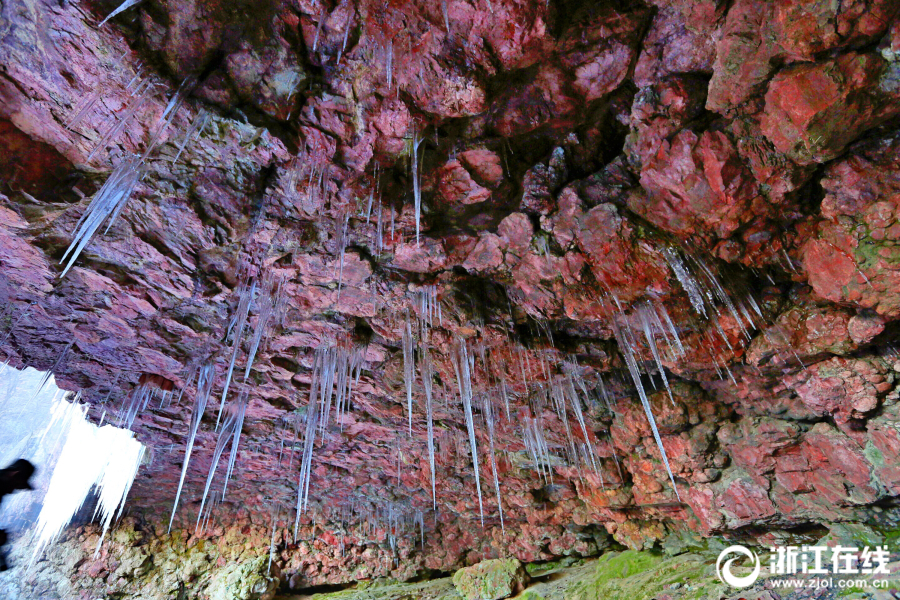 近日,受低温影响,海拔800米的余姚四明山鹁鸪岩溶洞瀑布结起冰瀑。(浙江在线 拍友 周耀辉 摄)