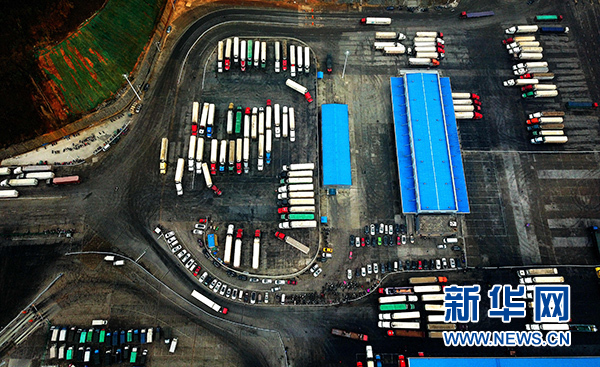1月16日,来自东盟国家的货车在凭祥市边境贸易监管中心等候装运货物。新华社记者 张爱林 摄
