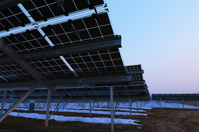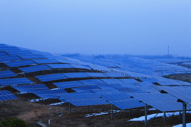 一块块蔚蓝醒目的太阳能板在阳光的照射下熠熠生辉