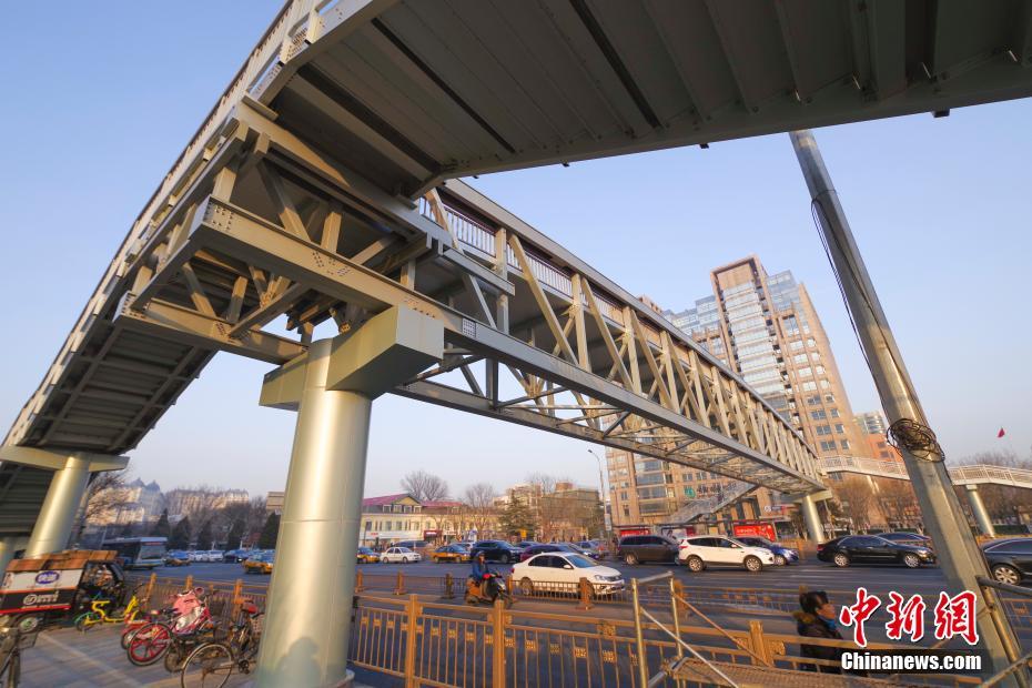1月18日,北京东单路口北天桥。东单路口北“银街天桥”建于1999年,已经成为长安街周边一处地标性建筑,但由于建造年头久远,钢结构桥梁锈蚀严重,于2017年11月拆除重建。改造后的天桥为铝合金桁架结构,桥梁全长58米,宽3.85米,单跨跨径达到52米,是中国国内单跨最大的铝合金桁架天桥。 中新社记者 贾天勇 摄