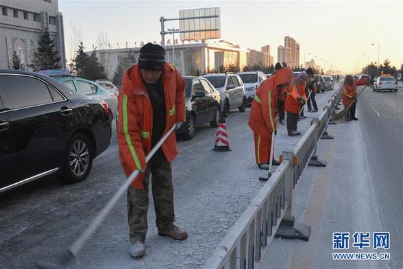 内蒙古自治区呼伦贝尔市冬季漫长。12月22日,环卫工人在道路上清雪除冰。新华社记者 刘磊 摄