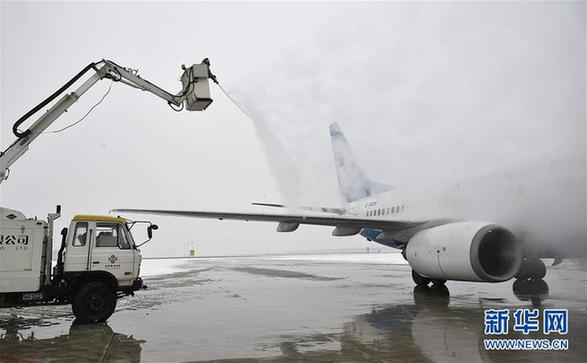 1月4日,银川河东国际机场机务人员对飞机进行除冰作业。新华社记者 王鹏 摄