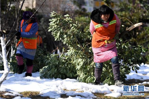 1月11日,持续大雪将合肥很多城市绿化树木压折,几名绿化工人在清理折断的树枝。新华社记者刘军喜摄