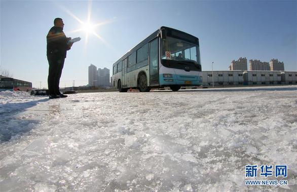 1月12日,在山东烟台孙家滩公交场站,工作人员考核驾驶员冰雪路面驾驶技能。新华社发(唐克 摄)