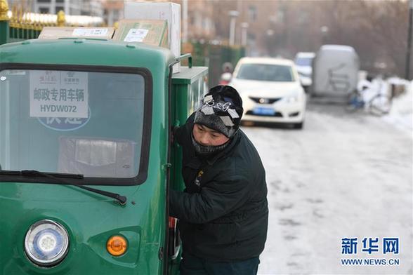 1月23日,“冰城”哈尔滨市最低气温为零下35摄氏度,投递员于明宝冒着严寒,像往常一样为客户投递邮件。新华社记者 王松摄
