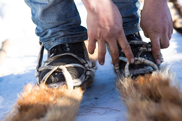 数九寒天,位于我国西北边陲的新疆阿勒泰地区千里冰封,接近零下三十度的气温和茫茫白雪点燃了滑雪爱好者的热情,在头戴彩色护目镜、身着鲜艳滑雪服的滑雪者中间,一群身着传统服饰、手拿木杖、脚踏毛皮滑雪板的蒙古族和哈萨克族小伙分外抢眼。因发现距今约1.2万年前人类滑雪姿态图案岩画,阿勒泰被称为“人类滑雪起源地”,当地人使用的毛皮滑雪板被认为是最古老的滑雪板之一。数百年前,牧民曾以毛皮滑雪板作为狩猎的主要交通工具,用松木做板芯,滑行面用马小腿皮包裹,上山时逆毛,增加摩擦和抓地作用,下山时顺毛,滑行如风,仅用一根木制手杖调整方向。如今,在远离居住点的深山冬牧场里,毛皮滑雪板依然是牧民放牧的主要工具。
