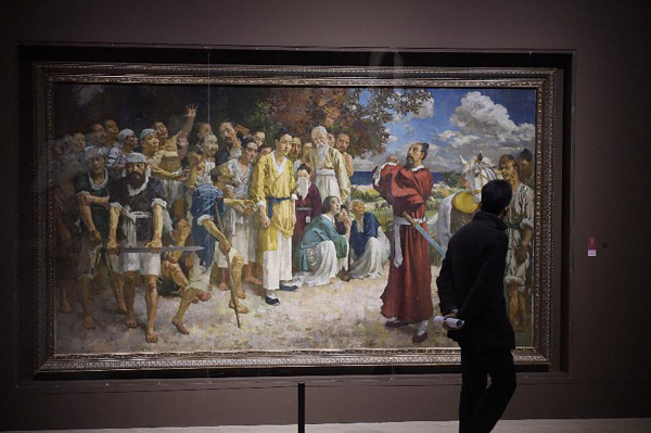 118件具有时代标志性和历史价值性的徐悲鸿作品1月25日起亮相中国美术馆,拉开中国美术馆2018新年展的帷幕。此次展览是国内外第一次围绕徐悲鸿大型美术主题创作进行的全方位策展,也是徐悲鸿美术精品近十年来首次大规模地集中展示。同时开展的还有“花开盛世——中国美术馆藏花鸟画精品展”和“笔墨当随时代——弘扬新金陵画派精神江苏美术采风作品展”,三个重磅展览勾勒出中华美学精神传承与弘扬的时代线索。图为观众在参观“民族与时代——徐悲鸿主题创作大展”的展品《田横五百士》。