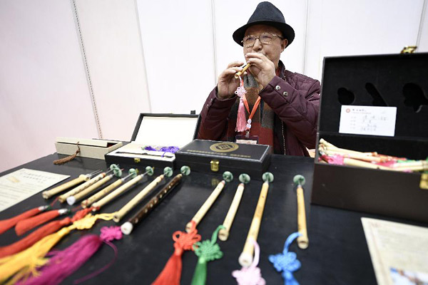 来自宁夏的回族民间乐器“咪咪”制作传承人在现场演奏(1月24日摄)。日前,首届西北五省区非遗文化旅游博览会在宁夏固原市隆德县举行。本届博览会通过非遗大讲堂、特色文化展演、手工艺品义卖等形式,让观众近距离感受非遗文化魅力。