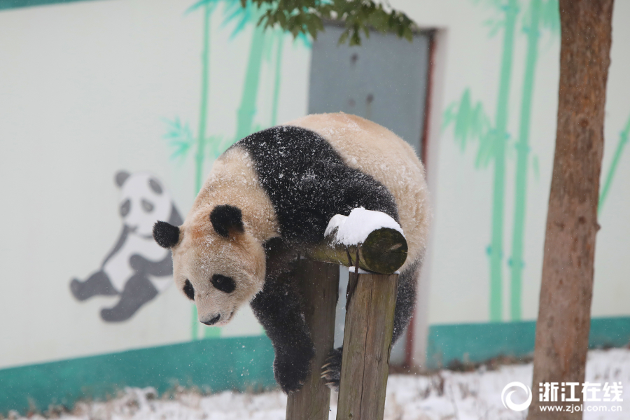 1月25日,德清县下渚湖熊猫园的两只熊猫在雪地里打滚、撒欢、滑雪,萌态尽显。(浙江在线拍友 李杰 摄)