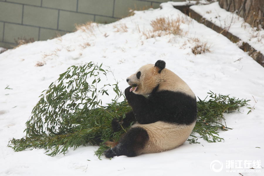 德清:雪后熊猫 萌态尽显