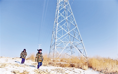 1月26日,杨忠武(右)与宋金泊在雪地里徒步行进。为保障线路运行,国家电网长春供电公司输电运检室带电作业班班长杨忠武和徒弟宋金泊每天都要在雪地里徒步巡线3个多小时。