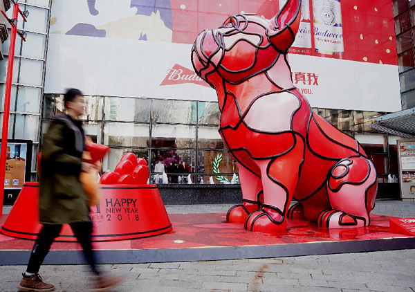 1月29日,游客从上海街头卡通狗艺术装置旁走过。当日,农历狗年新春艺术装置展在上海新天地揭幕,由玻璃钢打造的卡通狗艺术装置“身披”象征喜庆红火的中国红色调“外衣”,营造出温馨甜蜜的新春节日氛围。
