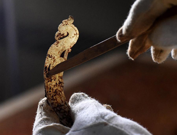 工作人员在现场清理出一件凤首玉佩(1月28日摄)。近日,海昏侯墓园五号墓主棺文物提取工作接近完成。经过数日细致工作,考古人员从主棺内提取出百余件珍贵文物,其中韘形佩、玉剑彘等一批深埋地下两千多年的精美玉器重现世间。此前专家在五号墓中清理出一枚刻有“刘充国印”字样的铜印,结合此前刘贺墓中出土的木牍及《汉书》等文献记载,推断五号墓墓主身份为刘贺长子刘充国。