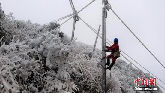 资料图:1月29日,广西护鸟坳,滚贝乡供电所职工登上被凝冻的电杆检修线路。石峰 摄