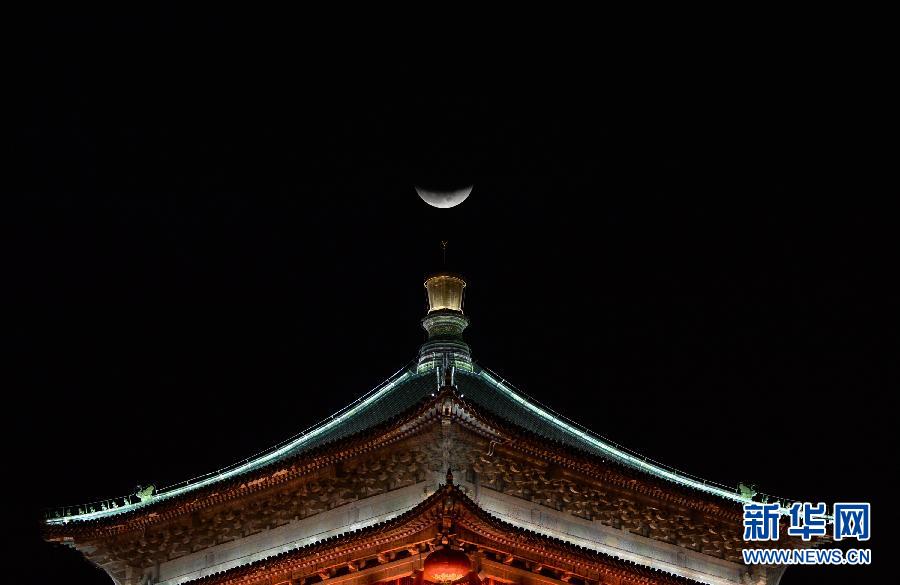 新华社照片,西安,2018年1月31日 天幕上演月全食美景 华夏共度“红月亮之夜” 这是1月31日在陕西省西安市钟楼拍摄的月亮。当日是丁酉鸡年最后一个满月夜,天空中上演月全食大戏。我国大部分地区都能欣赏到一轮“红月亮”高悬夜空的迷人景象。 新华社记者 李一博 摄