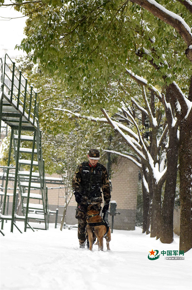 1月27日,武警安徽总队机动支队警犬班班长王营广与警犬“鲁克”互动交流,增进情感。
