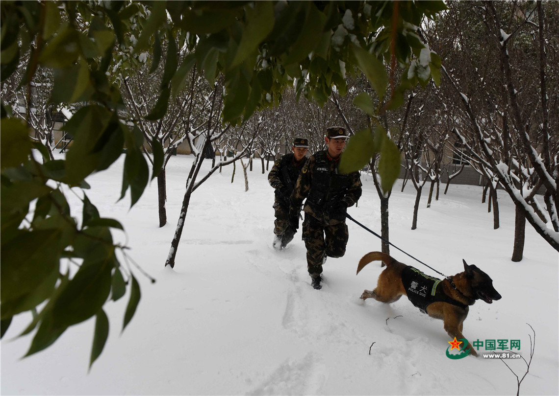 1月27日,武警安徽总队机动支队警犬班班长王营广(前)带领警犬“鲁克”进行武装追捕训练。