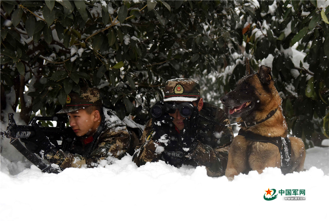 1月27日,武警安徽总队机动支队警犬班班长王营广带领警犬“鲁克”进行隐蔽侦察训练。