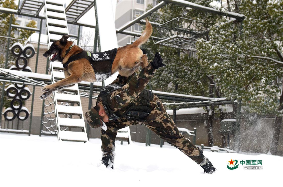 1月27日,武警安徽总队机动支队警犬班班长王营广与警犬“鲁克”进行人犬结合训练。