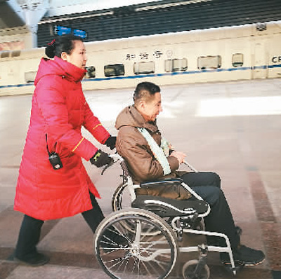 来自黑龙江齐齐哈尔的赵大哥在北京站工作人员帮助下进站。叶聪 摄