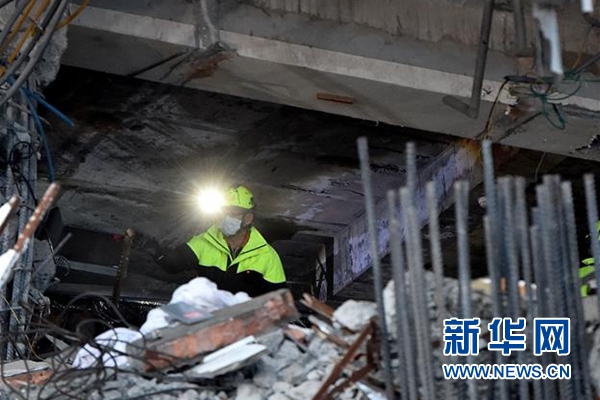 2月7日,救援人员在倾倒的花莲云门翠堤大楼进行救援。新华社记者 岳月伟 摄