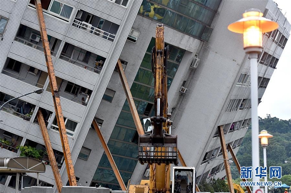 2月7日,救援人员用钢架支撑倾倒的花莲云门翠堤大楼。新华社记者 岳月伟 摄