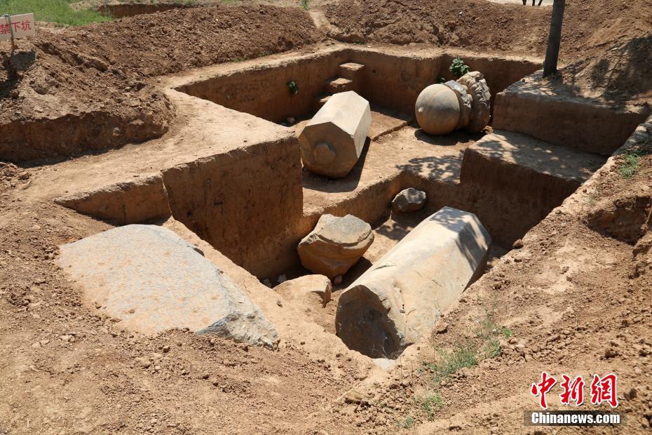 2月7日,陕西省考古研究院透露,考古人员对唐元陵的神道石刻及下宫遗址进行了考古发掘和清理,新出土鸵鸟等石刻27件,并发现两座大型建筑基址。图为元陵神道西石柱。中新社记者 钟欣 摄