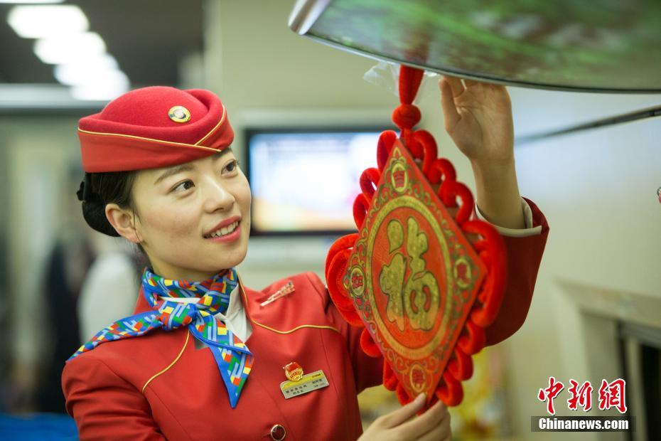 春节临近 高铁乘务员车厢贴福迎新春