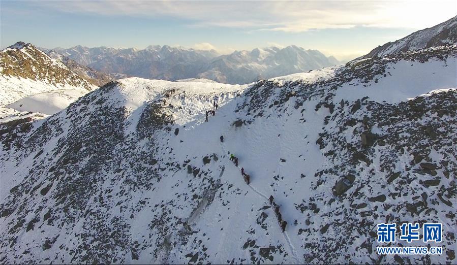 巡诊队沿着几乎垂直的牧道翻越海拔4000多米的乔拉克达坂(2017年12月15日摄)。新华社记者 江文耀 摄