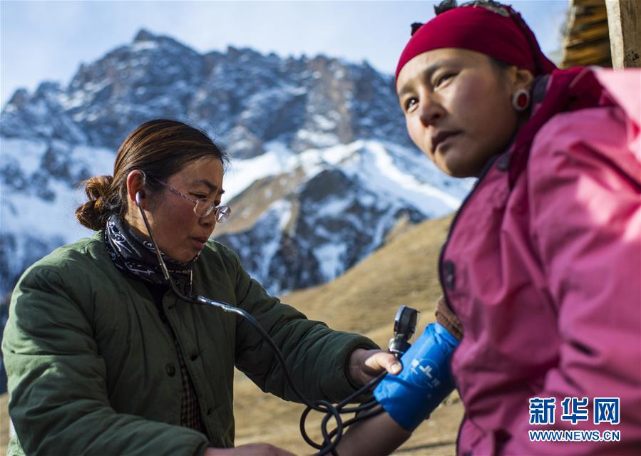 巡诊队里唯一的女医生张红英(左)在为牧民检查身体(2017年12月18日摄)。新华社记者 江文耀 摄