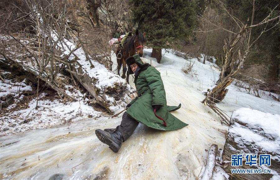 巡诊队医生叶力夏提从一处冰坡滑下(2017年12月21日摄)。 新华社记者 江文耀 摄