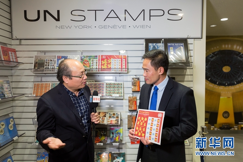2月7日,在位于纽约的联合国总部,联合国邮政管理局局长谢德胜(右)接受记者采访。新华网记者李木子 摄
