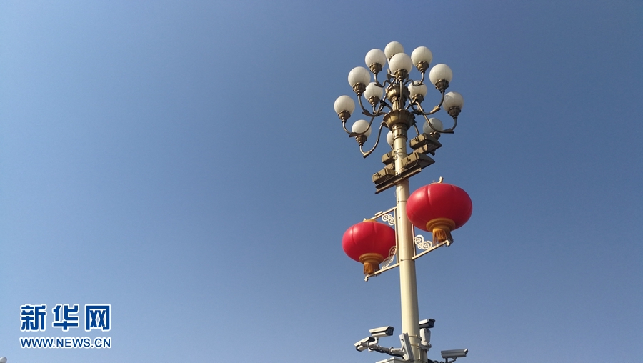 2018年2月15日,天安门广场外的灯柱用红灯笼装饰一新,喜迎农历新年。红色代表着喜庆、热闹、祥和,是中国人最为崇尚的吉祥之色。新年来临,中国红无处不在,到处都洋溢着喜气洋洋的节日气氛。新华网 张明宇摄