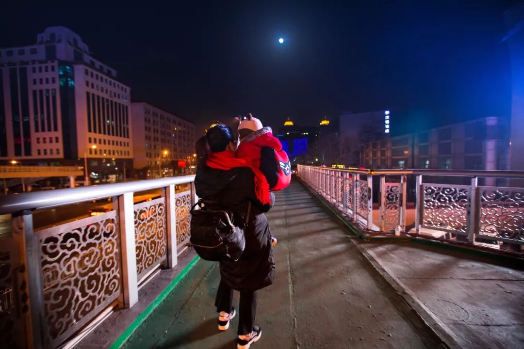 2018年1月31日。北京站,一对准备回家过年的母子望着一轮明。月份牌 摄