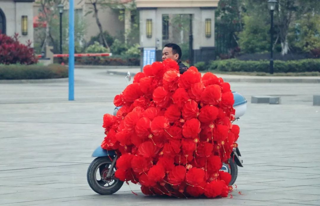 2018年2月12日。广西崇左。年味越来越浓了,男子带着一车红灯笼行驶在路上。沐古 摄