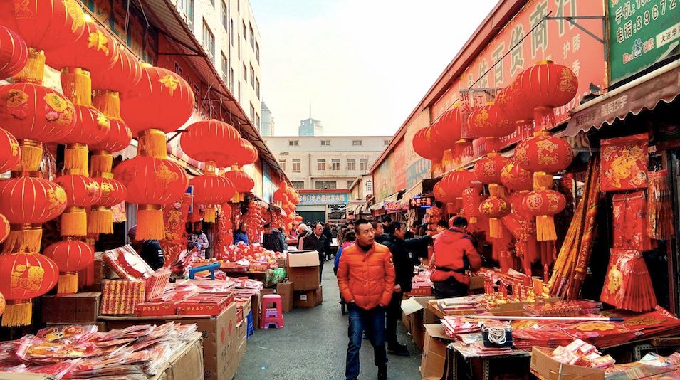 2018年1月31日。辽宁大连。市场到处挂着大红灯笼,赶集的人左挑右选。光圈速度 摄