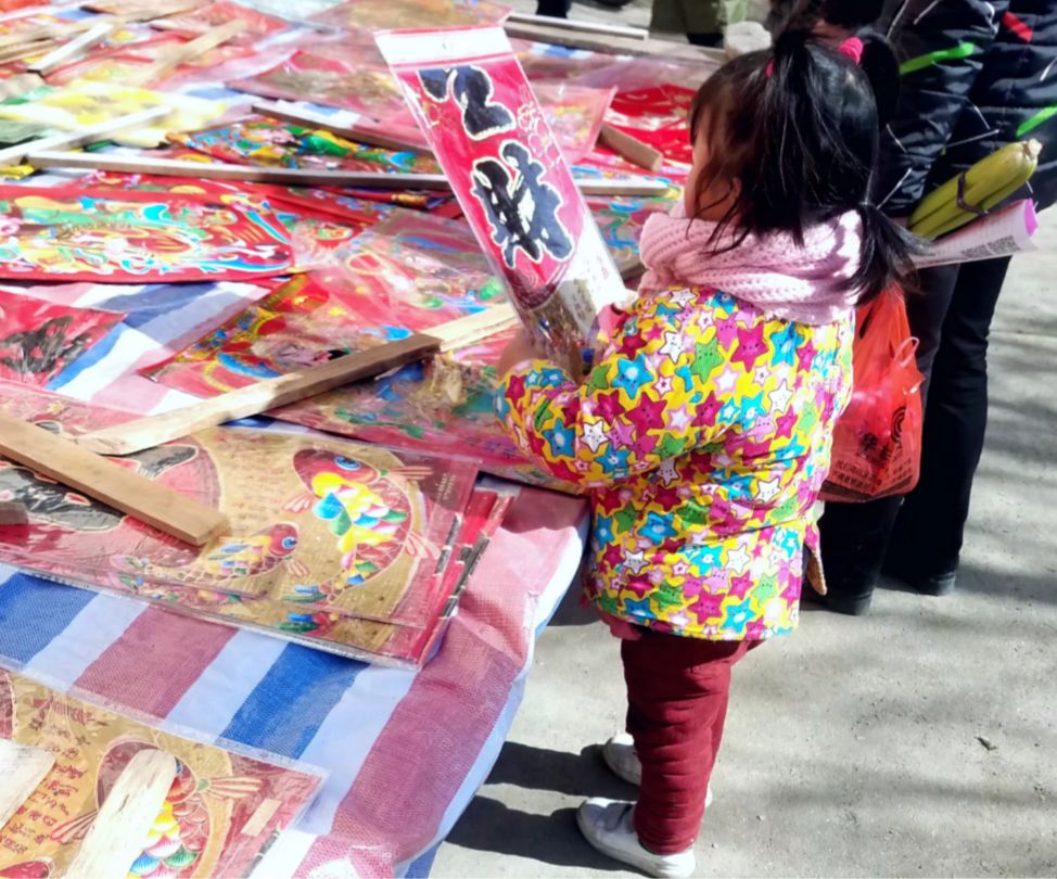 2018年2月14日。河南三门峡。年集卖春联的小摊前,一个小女孩手拿着春联,饶有兴趣。刚子 摄