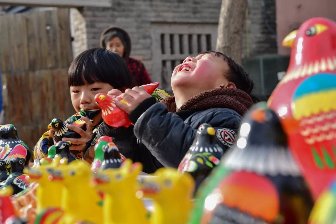 2018年2月1日。河南浚县。杨玘屯村,孩子们开心地吹泥沽沽。无花果 摄