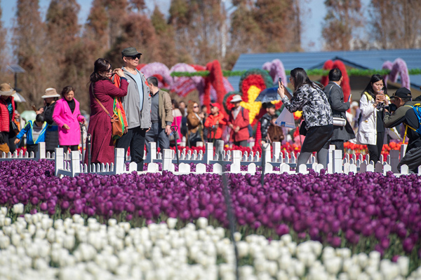 游客在云南省昆明市捞鱼河湿地公园郁金香花海中拍照(2月17日摄)。新华社记者 胡超 摄