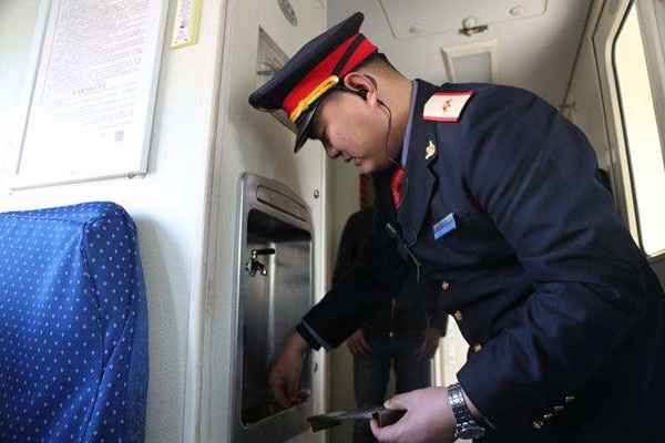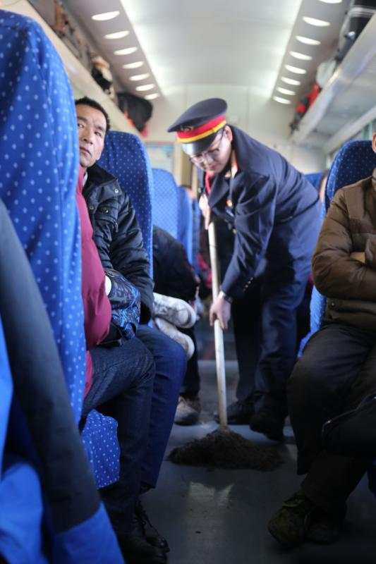 5号车厢列车员薛凯鹏在擦拭地板。