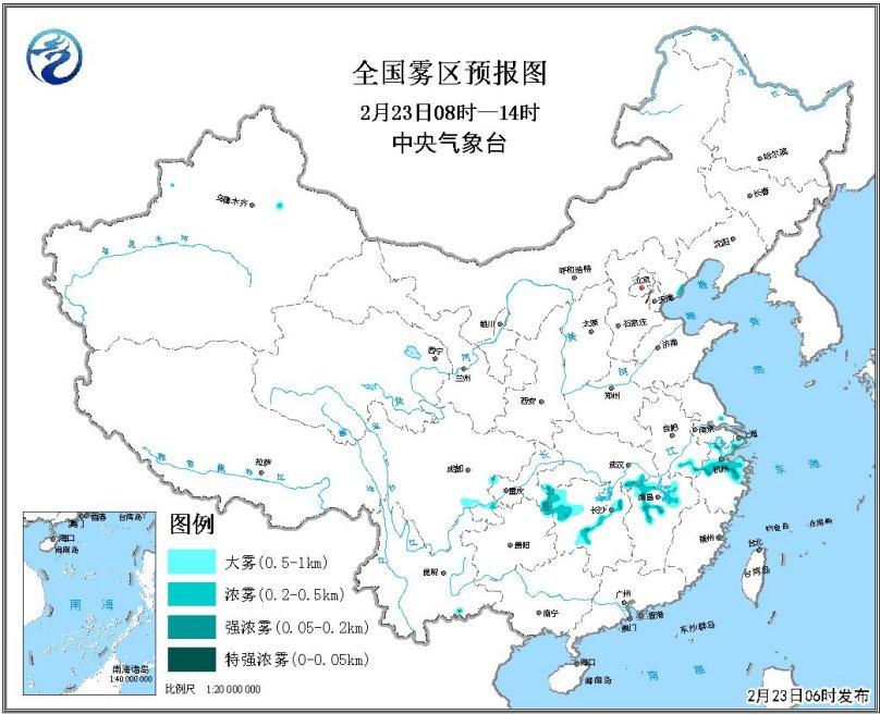 23日早晨至上午,安徽南部、江苏南部、浙江北部、江西北部、湖北东南部、湖南西北部和中部、四川盆地南部等地有大雾天气,其中浙江北部、江西北部、湖南西北部和中部等地的部分地区有浓雾,局地能见度低于200米。中央气象台2月23日06时继续发布大雾黄色预警。