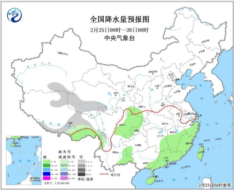 25日08时至26日08时,青藏高原中部和南部等地有小雪或雨夹雪;西北地区东南部、四川盆地、江南南部、华南中东部、云南西北部和东南部、海南岛、台湾等地有小雨。内蒙古中西部等地有4~5级风。