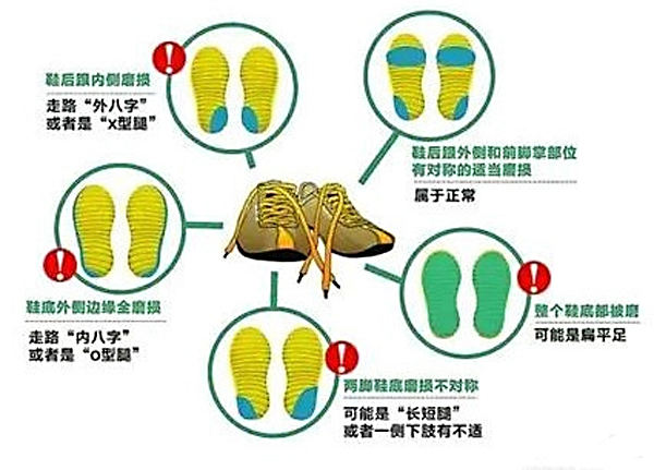鞋底内侧磨损较多,可能是小腿向外弯曲,有形成X腿的危险;