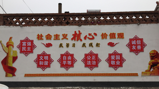 图为南石村委办公楼对面引人注目的标语。新华网记者 陈丽 摄