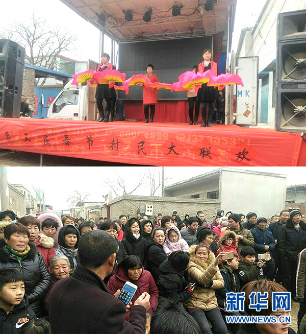 拼版照片:上图为,2月21日,河北任县象王庄举行“春节村民大联欢”;下图为,“春节村民大联欢”吸引众多村民观看。新华网发