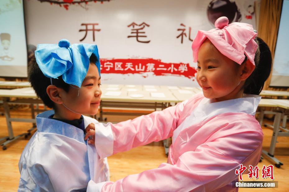 学童们进行“开笔礼”第一个环节互正衣冠。所谓先正衣冠,后明事理。 张亨伟 摄