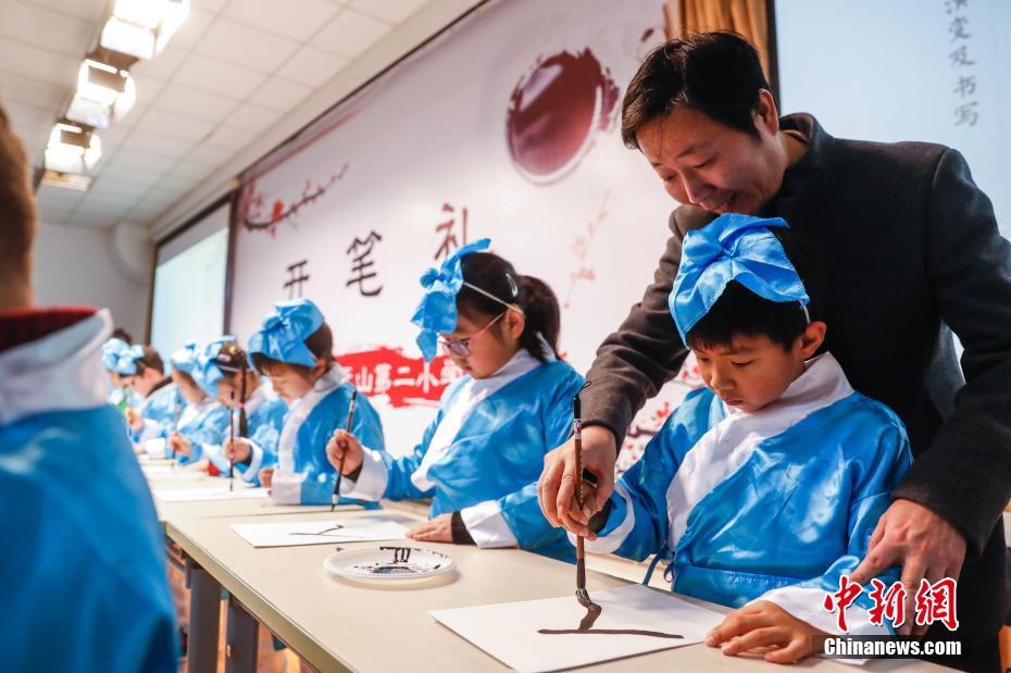 随着“唐宋诗词热”、“国学热”等现象的出现,优秀传统文化与当代教育再次“融”为一体。2月26日,上海市天山第二小学为在校的一年级学童举行“开笔礼”,为儿童启蒙教育“破蒙”。