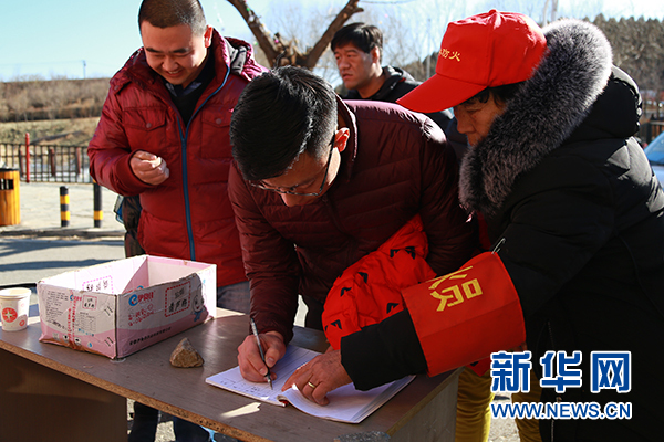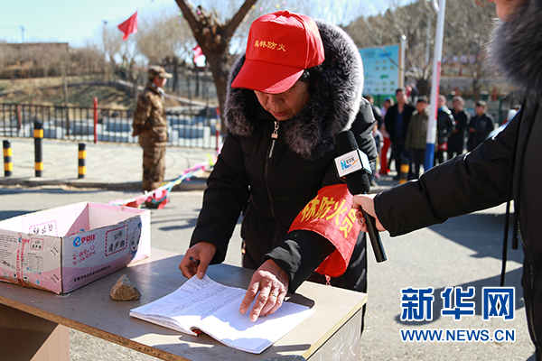 上山游客做登记并将打火机暂存给护林员。新华网 周靖杰 摄