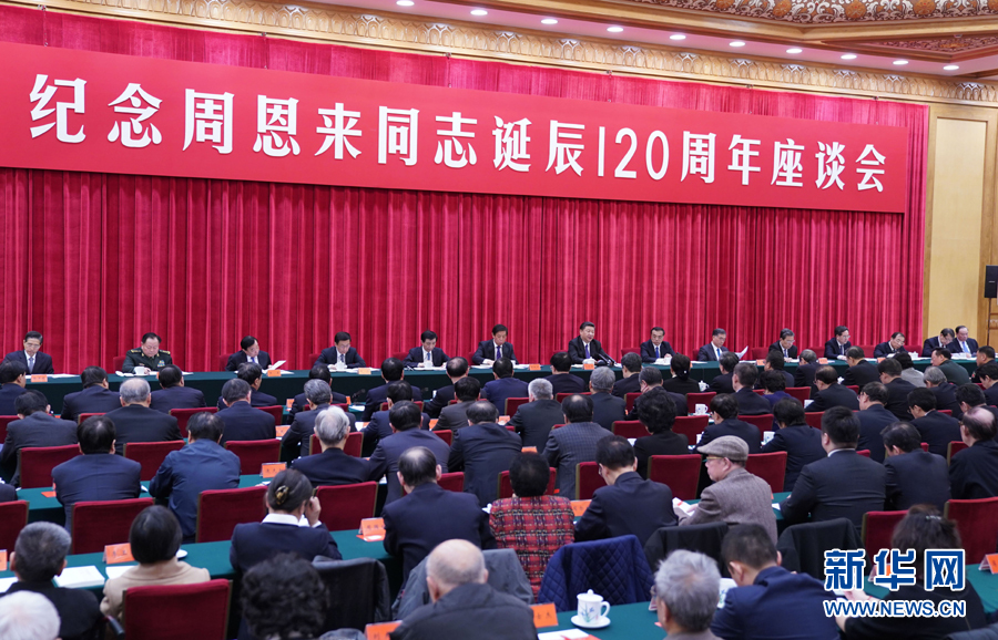 3月1日,中共中央在北京人民大会堂举行纪念周恩来同志诞辰120周年座谈会。中共中央总书记、国家主席、中央军委主席习近平发表重要讲话,中共中央政治局常委李克强、栗战书、汪洋、王沪宁、赵乐际、韩正出席座谈会。新华社记者谢环驰摄